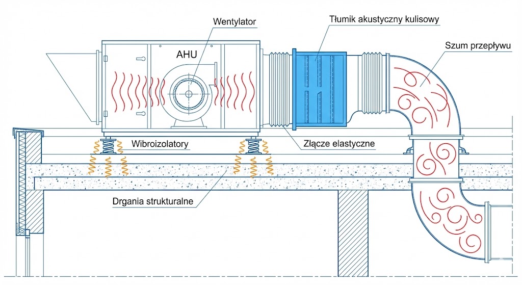 Hałas materiałowy/strukturalny (Structure-borne noise): To drgania generowane przez pracujące urządzenia (wentylatory, centrale, agregaty chłodnicze). Jeśli urządzenia te są sztywno połączone z budynkiem lub kanałami, drgania przenoszą się na ściany i stropy, które zaczynają promieniować dźwiękiem – często daleko od źródła.